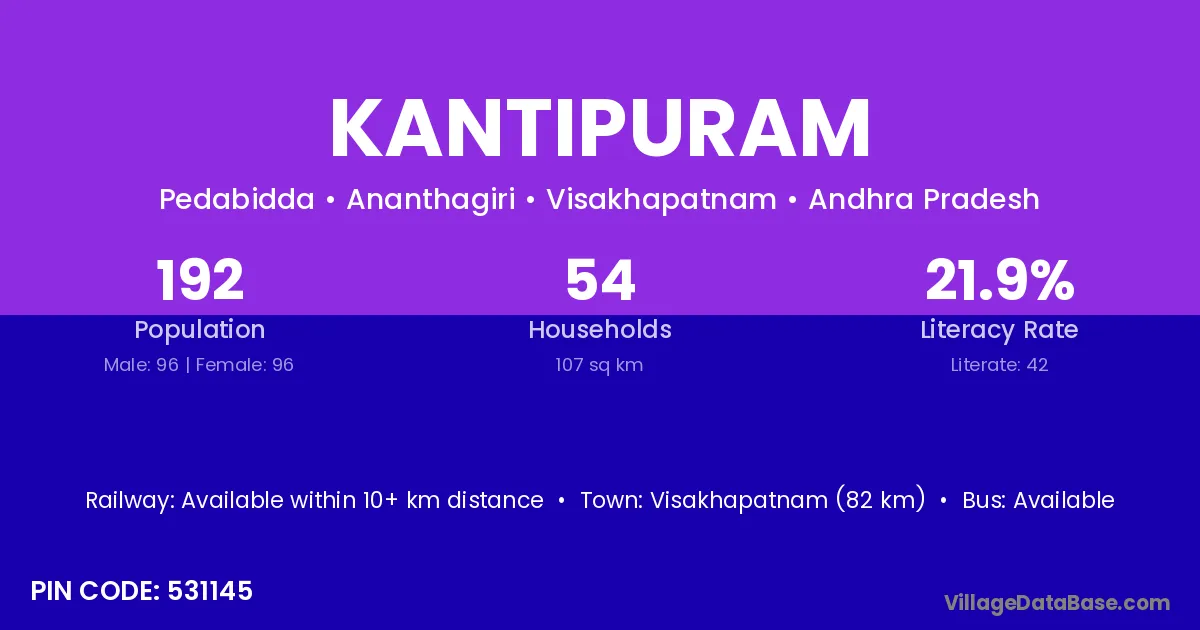 Visakhapatnam (82 km) is the nearest town to Kantipuram village for major economic activities and is located approximately 82 km away.