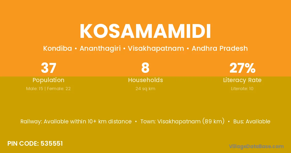 The literacy rate of Kosamamidi village is 27.03%. Male literacy stands at 53.33% and female literacy at 9.09%.