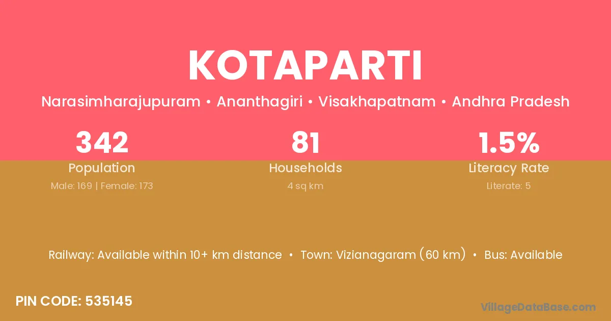 Vizianagaram (60 km) is the nearest town to Kotaparti village for major economic activities and is located approximately 60 km away.