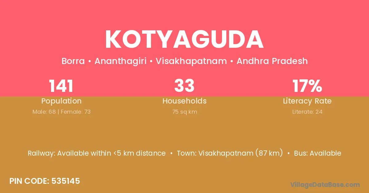 Kotyaguda village has a total population of 141 people, of which 68 are males and 73 are females.