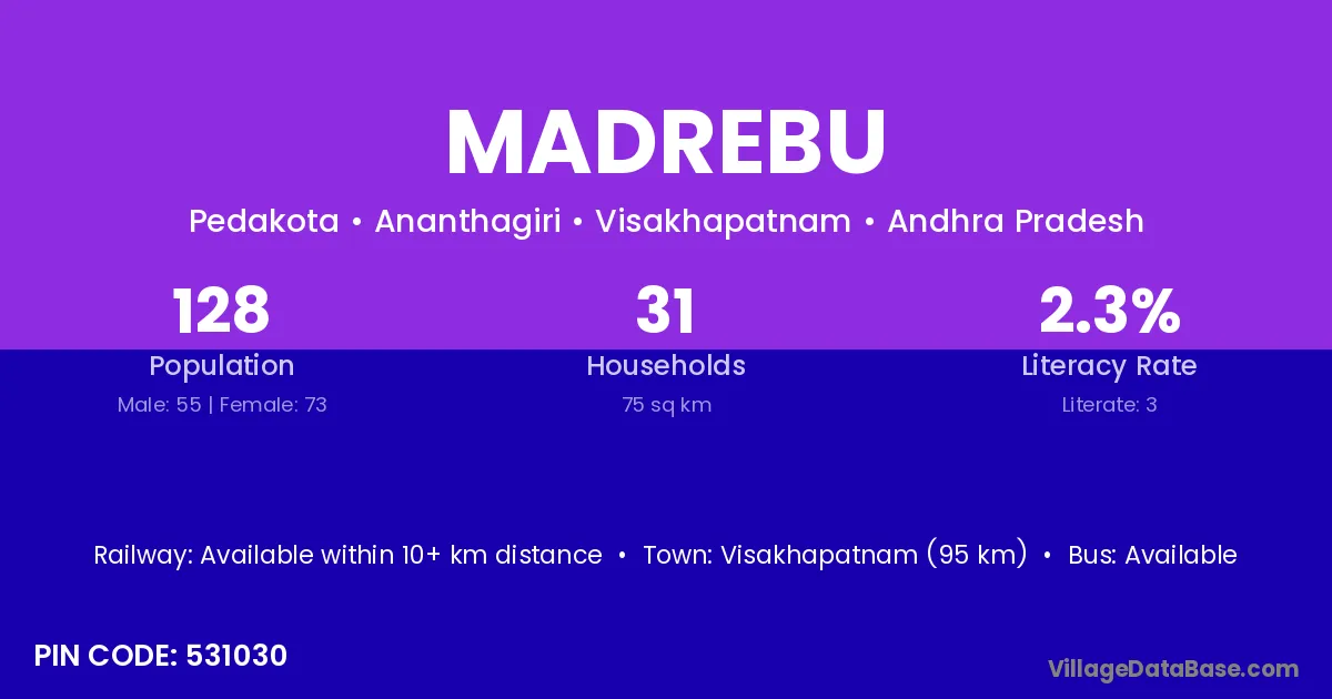 Visakhapatnam (95 km) is the nearest town to Madrebu village for major economic activities and is located approximately 95 km away.