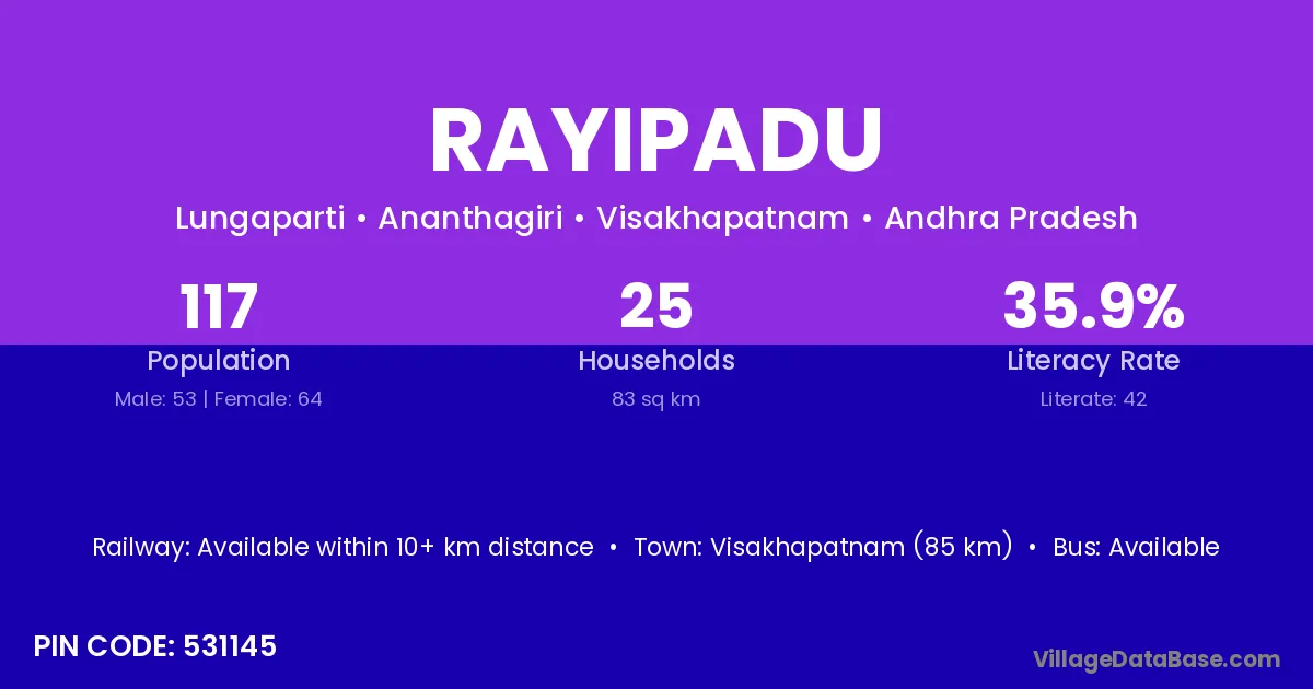 Rayipadu village has a total population of 117 people, of which 53 are males and 64 are females.