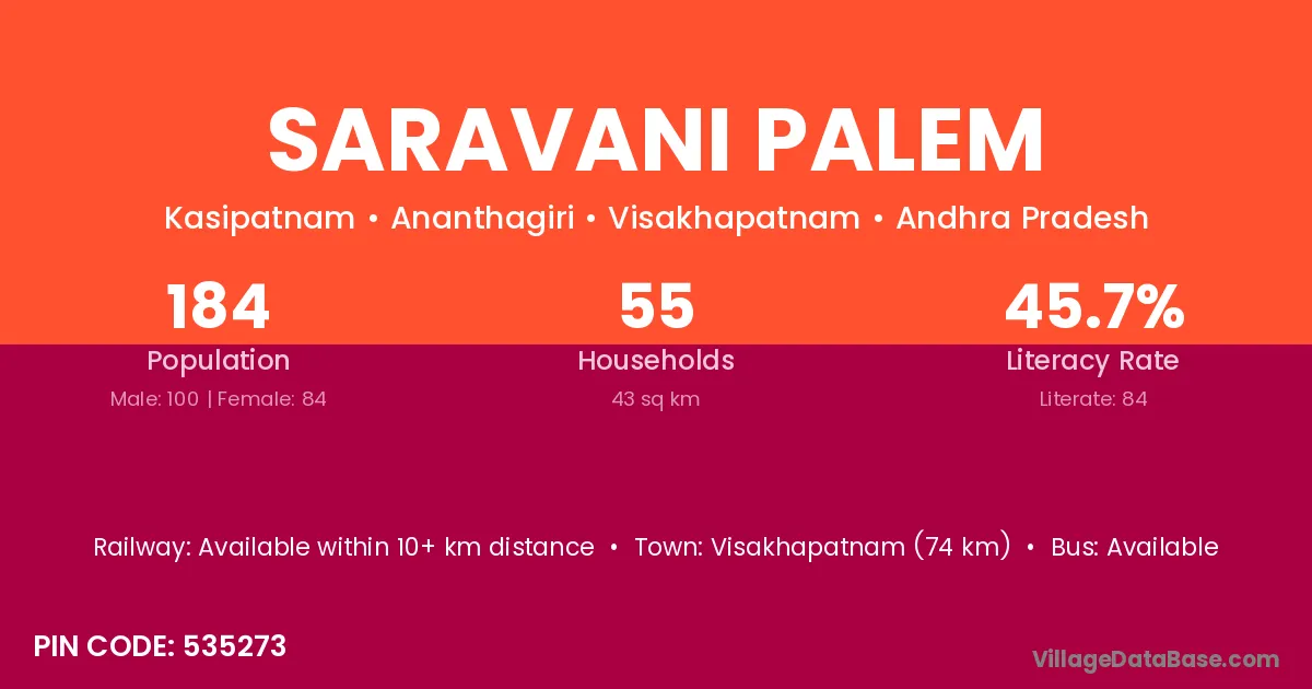Visakhapatnam (74 km) is the nearest town to Saravani Palem village for major economic activities and is located approximately 74 km away.