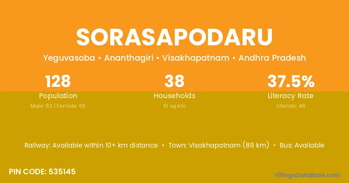 Sorasapodaru village has a total population of 128 people, of which 62 are males and 66 are females.