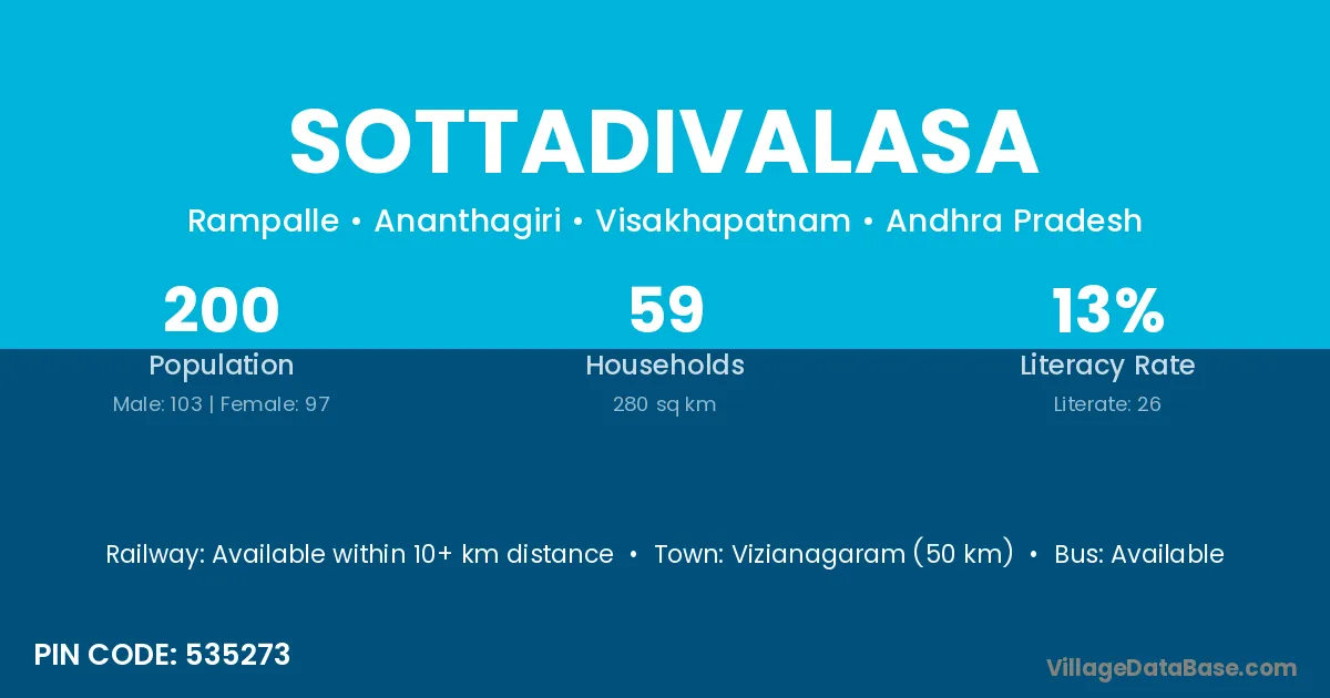 Sottadivalasa village has a total population of 200 people, of which 103 are males and 97 are females.