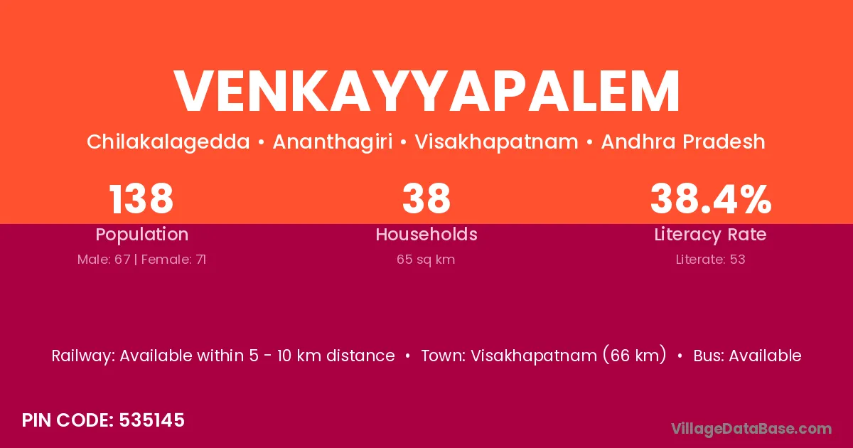 Venkayyapalem village has a total population of 138 people, of which 67 are males and 71 are females.