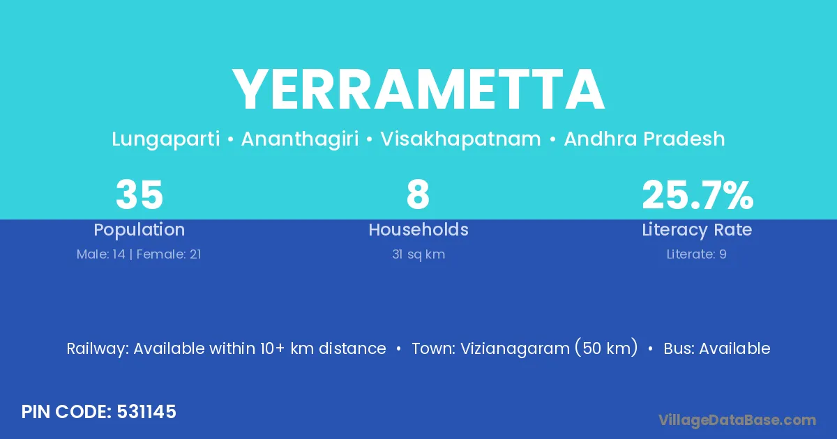 Vizianagaram (50 km) is the nearest town to Yerrametta village for major economic activities and is located approximately 50 km away.