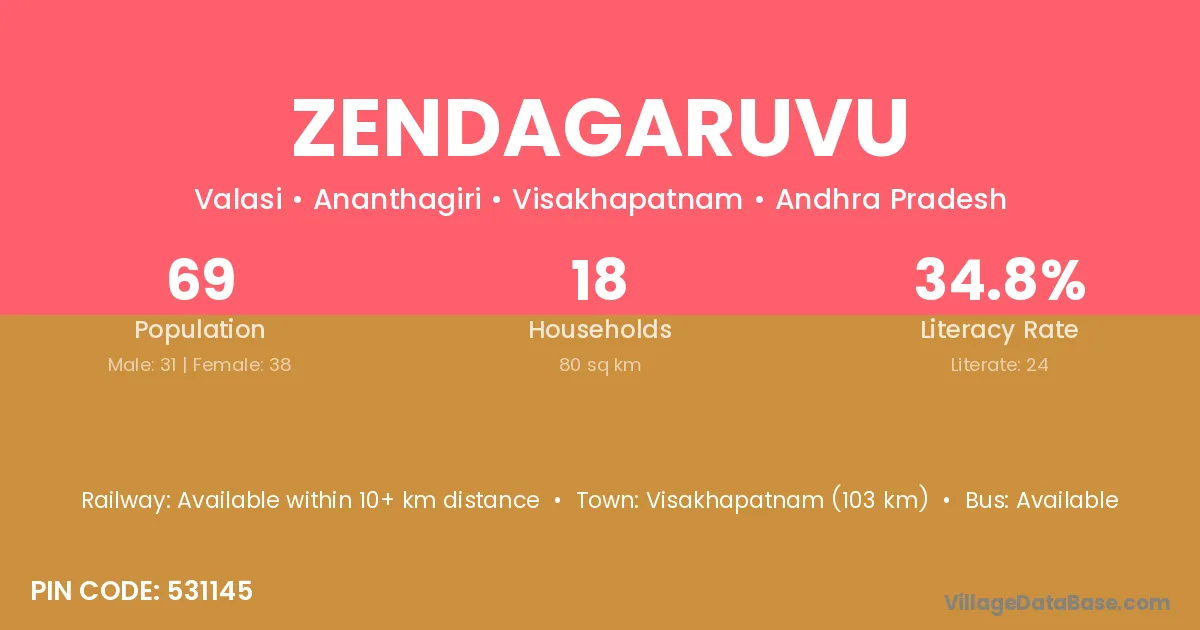 Zendagaruvu village has a total population of 69 people, of which 31 are males and 38 are females.