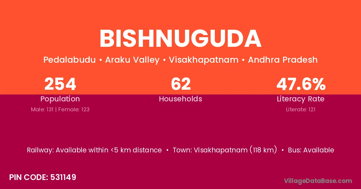 Bishnuguda village has a total population of 254 people, of which 131 are males and 123 are females.