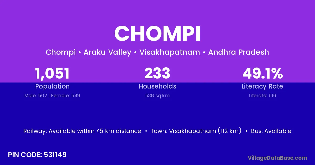 According to Census 2011 information, the village code of Chompi village is 531149.