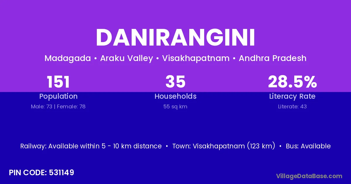 Danirangini village has a total population of 151 people, of which 73 are males and 78 are females.