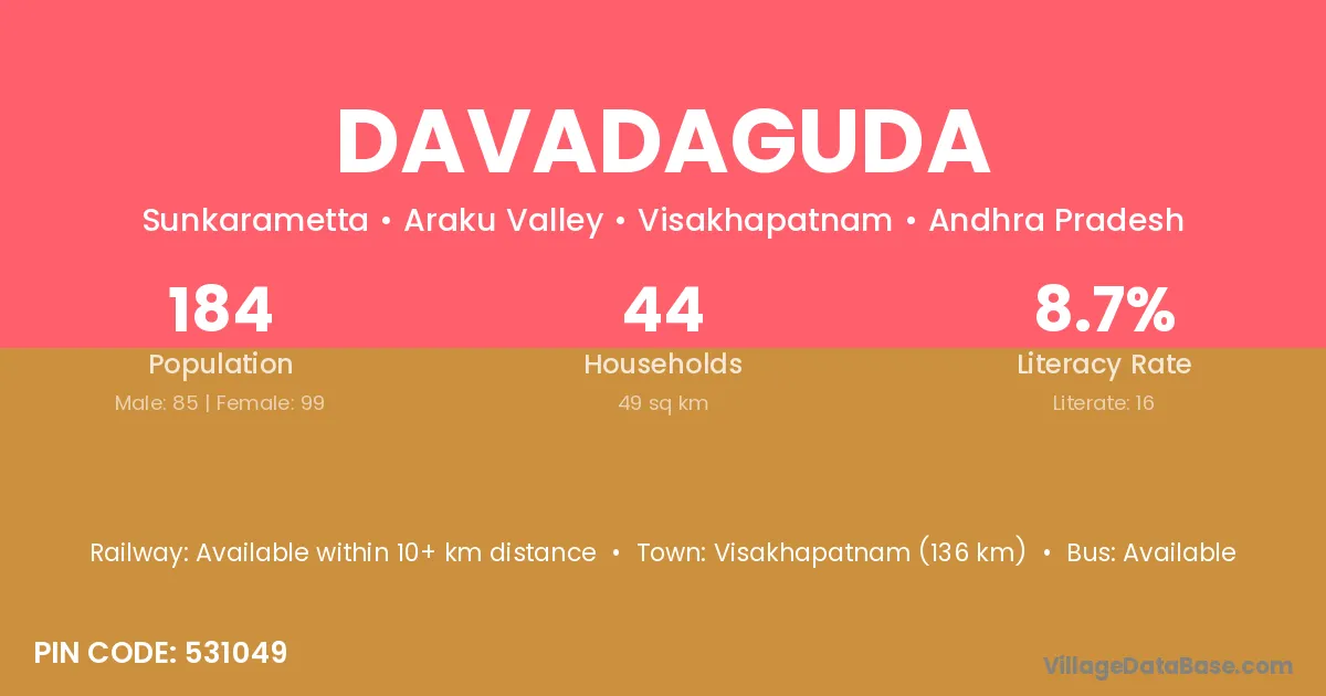 Visakhapatnam (136 km) is the nearest town to Davadaguda village for major economic activities and is located approximately 136 km away.