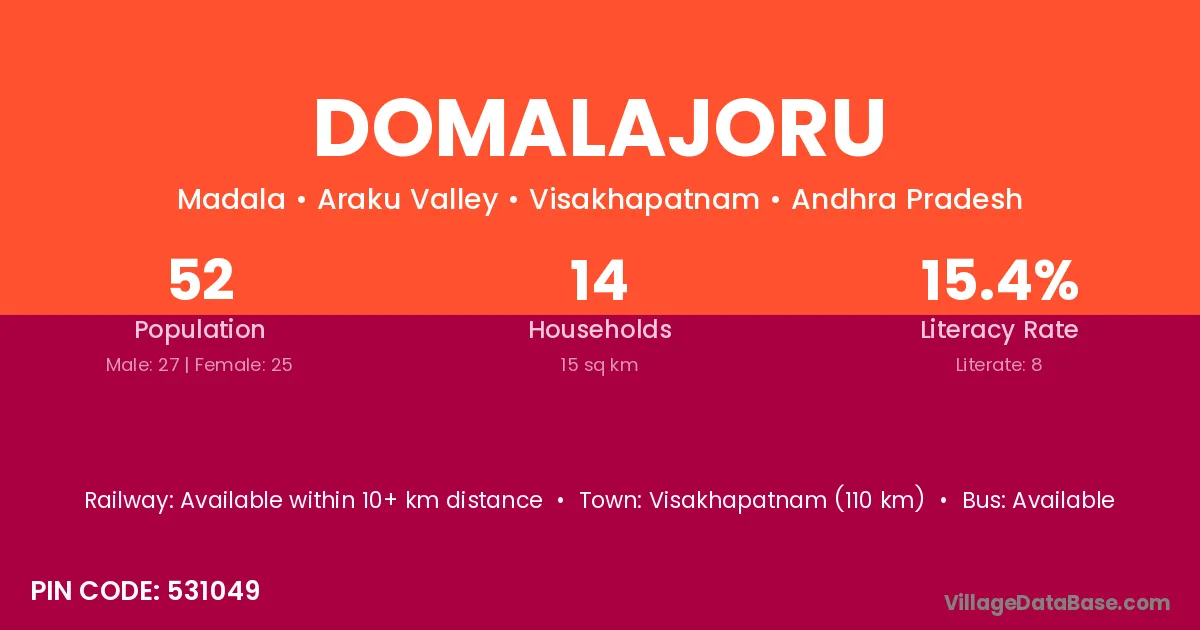 Visakhapatnam (110 km) is the nearest town to Domalajoru village for major economic activities and is located approximately 110 km away.