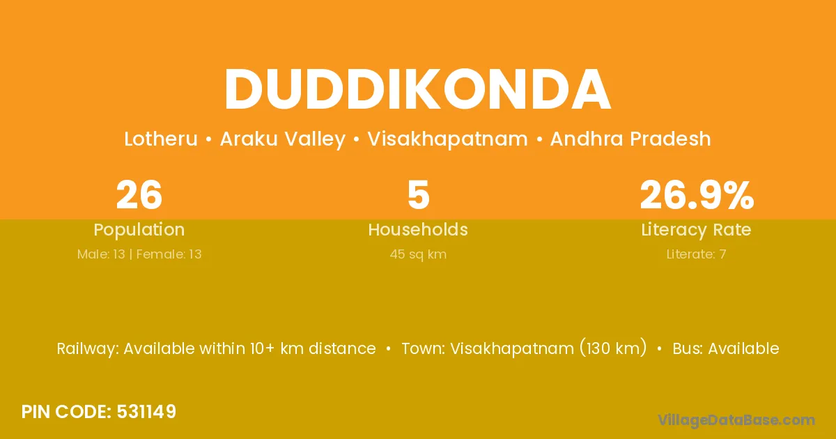 Visakhapatnam (130 km) is the nearest town to Duddikonda village for major economic activities and is located approximately 130 km away.