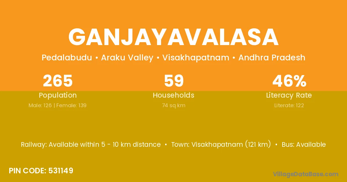 Ganjayavalasa village has a total population of 265 people, of which 126 are males and 139 are females.