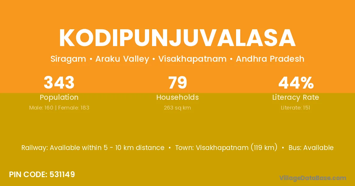 Kodipunjuvalasa village has a total population of 343 people, of which 160 are males and 183 are females.