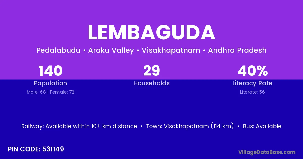 Visakhapatnam (114 km) is the nearest town to Lembaguda village for major economic activities and is located approximately 114 km away.