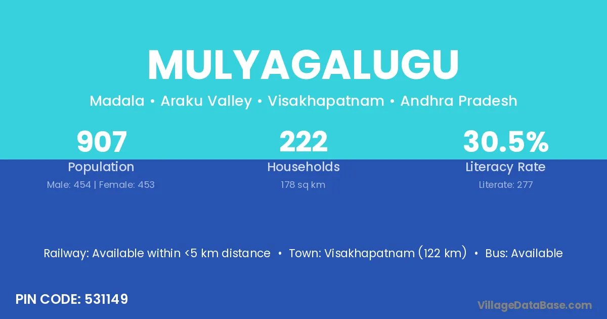 Visakhapatnam (122 km) is the nearest town to Mulyagalugu village for major economic activities and is located approximately 122 km away.