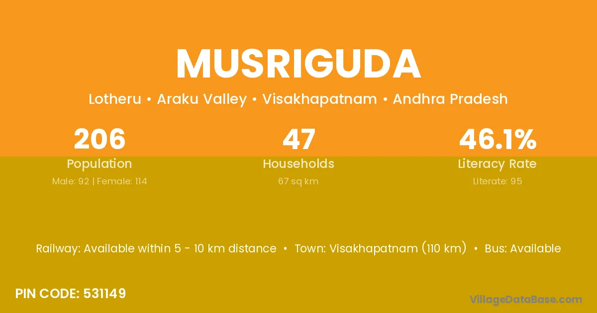 Visakhapatnam (110 km) is the nearest town to Musriguda village for major economic activities and is located approximately 110 km away.