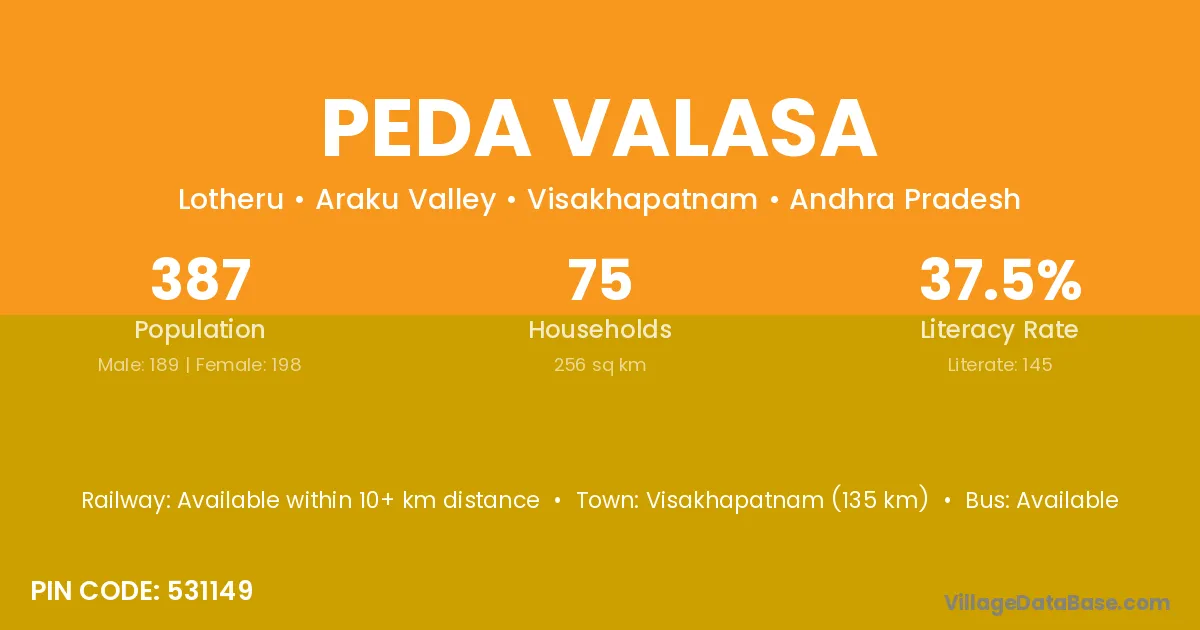 Peda Valasa village has a total population of 387 people, of which 189 are males and 198 are females.