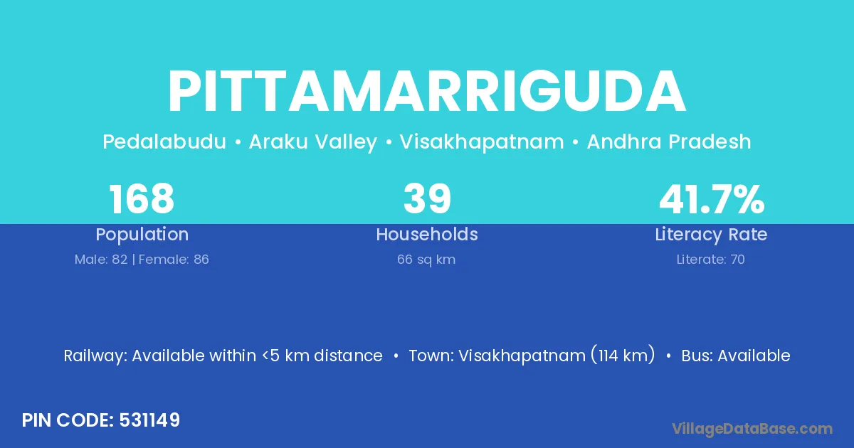 Visakhapatnam (114 km) is the nearest town to Pittamarriguda village for major economic activities and is located approximately 114 km away.