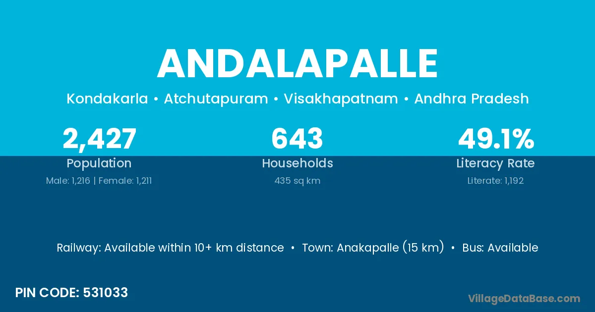 According to Census 2011 information, the village code of Andalapalle village is 531033.