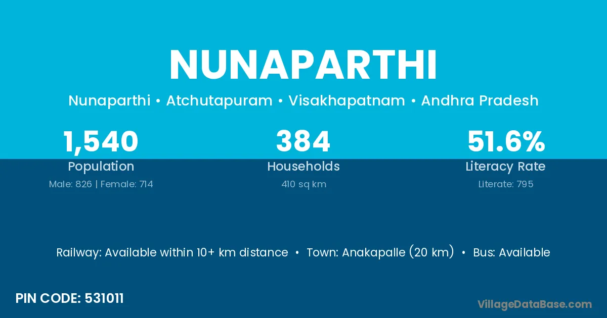 Anakapalle (20 km) is the nearest town to Nunaparthi village for major economic activities and is located approximately 20 km away.