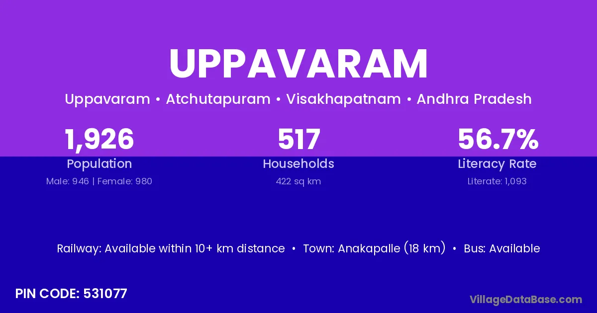 Anakapalle (18 km) is the nearest town to Uppavaram village for major economic activities and is located approximately 18 km away.