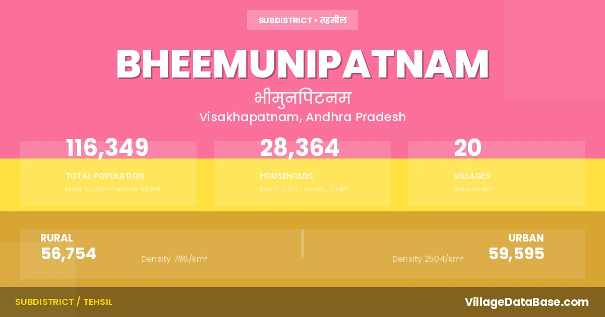According to the 2011 census The total area of Bheemunipatnam Mandal is 96 km², with a population of 116349 people. The population density is 1,212 inhabitants per square kilometre, and there are approximately 28364 houses in the sub district.