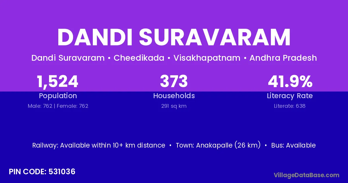 Anakapalle (26 km) is the nearest town to Dandi Suravaram village for major economic activities and is located approximately 26 km away.