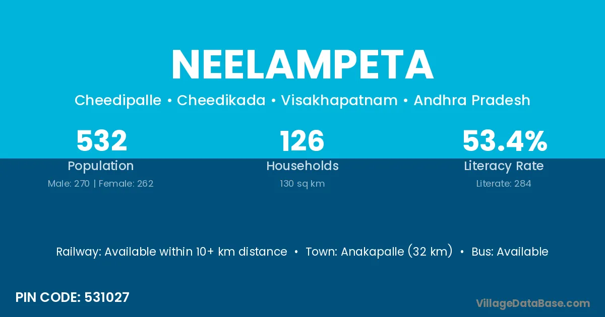 Anakapalle (32 km) is the nearest town to Neelampeta village for major economic activities and is located approximately 32 km away.