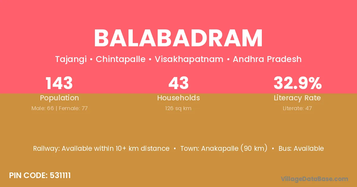 Anakapalle (90 km) is the nearest town to Balabadram village for major economic activities and is located approximately 90 km away.
