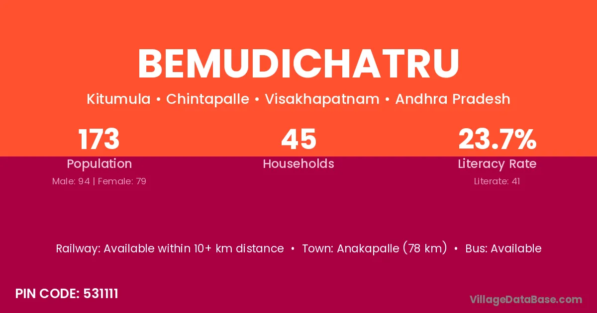 Bemudichatru village has a total population of 173 people, of which 94 are males and 79 are females.