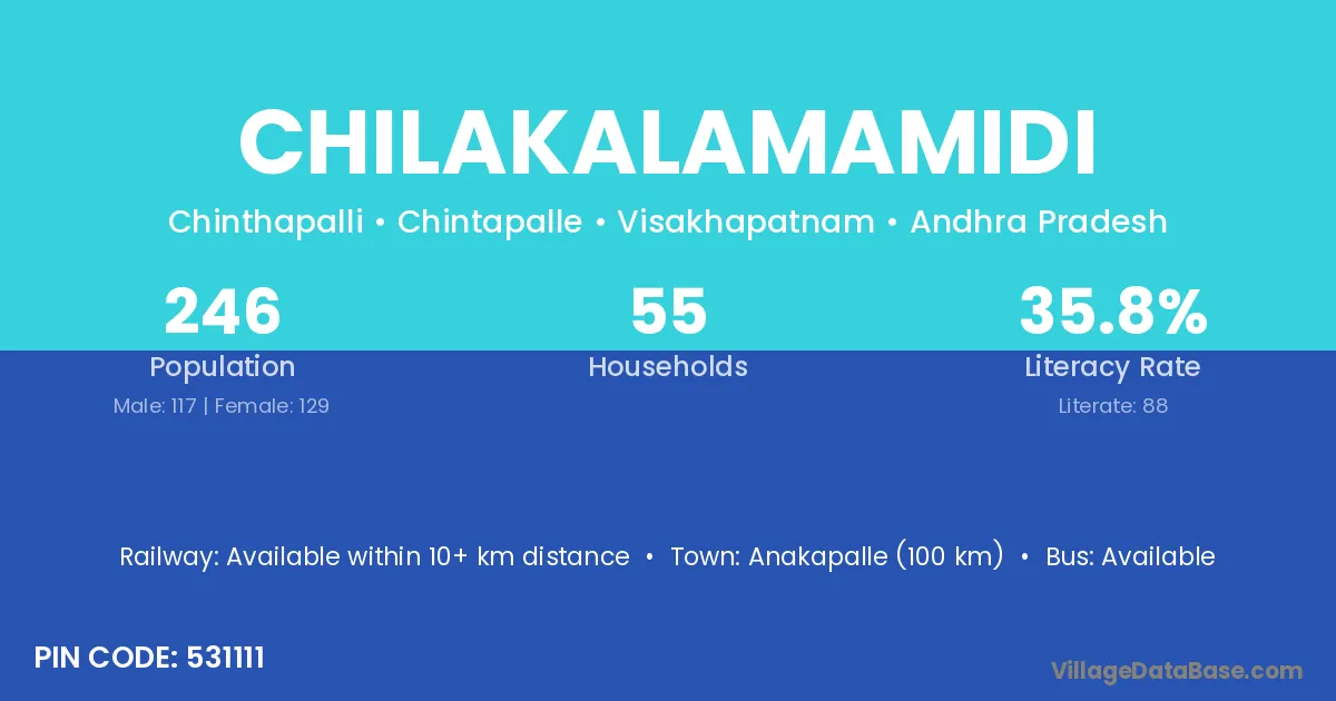 Chilakalamamidi village has a total population of 246 people, of which 117 are males and 129 are females.