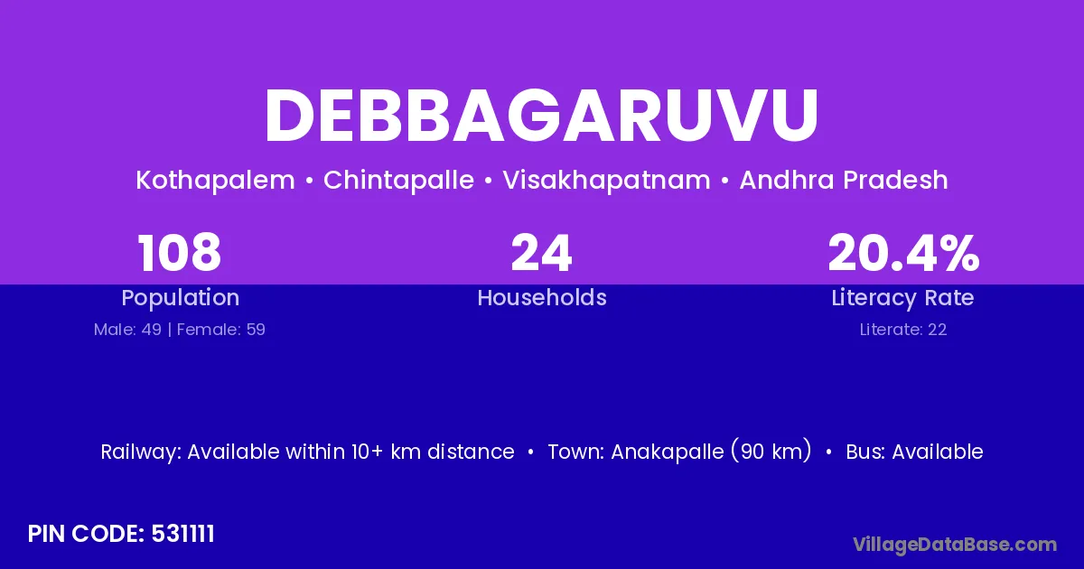 Debbagaruvu village has a total population of 108 people, of which 49 are males and 59 are females.