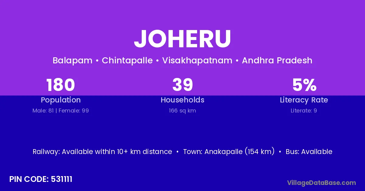 Anakapalle (154 km) is the nearest town to Joheru village for major economic activities and is located approximately 154 km away.