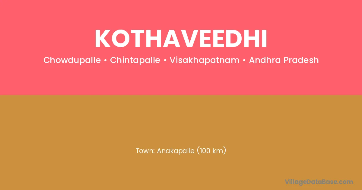 Anakapalle (100 km) is the nearest town to Kothaveedhi village for major economic activities and is located approximately 100 km away.