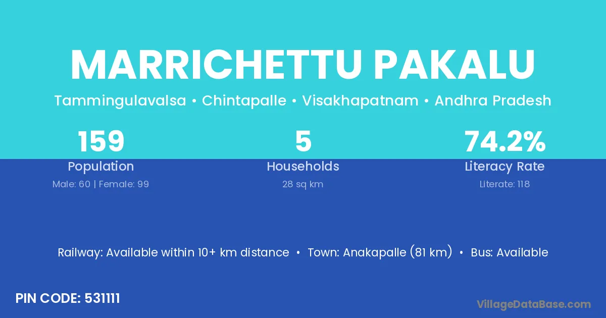 Marrichettu Pakalu village has a total population of 159 people, of which 60 are males and 99 are females.