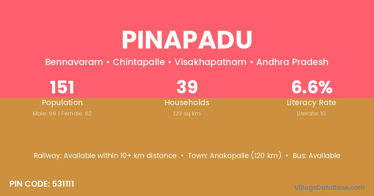 Anakapalle (120 km) is the nearest town to Pinapadu village for major economic activities and is located approximately 120 km away.