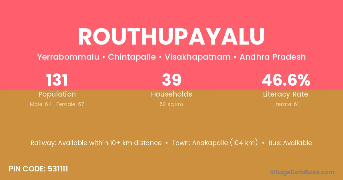 Routhupayalu village has a total population of 131 people, of which 64 are males and 67 are females.