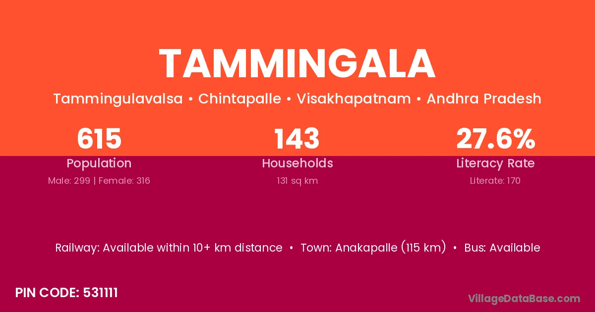 Anakapalle (115 km) is the nearest town to Tammingala village for major economic activities and is located approximately 115 km away.