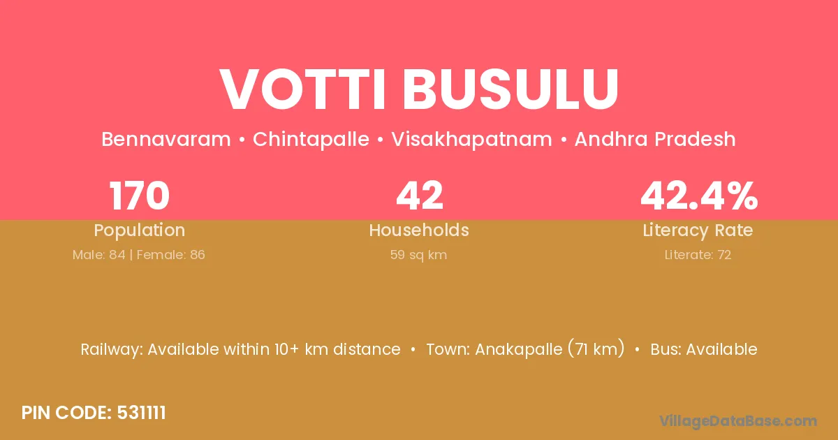 Votti Busulu village has a total population of 170 people, of which 84 are males and 86 are females.