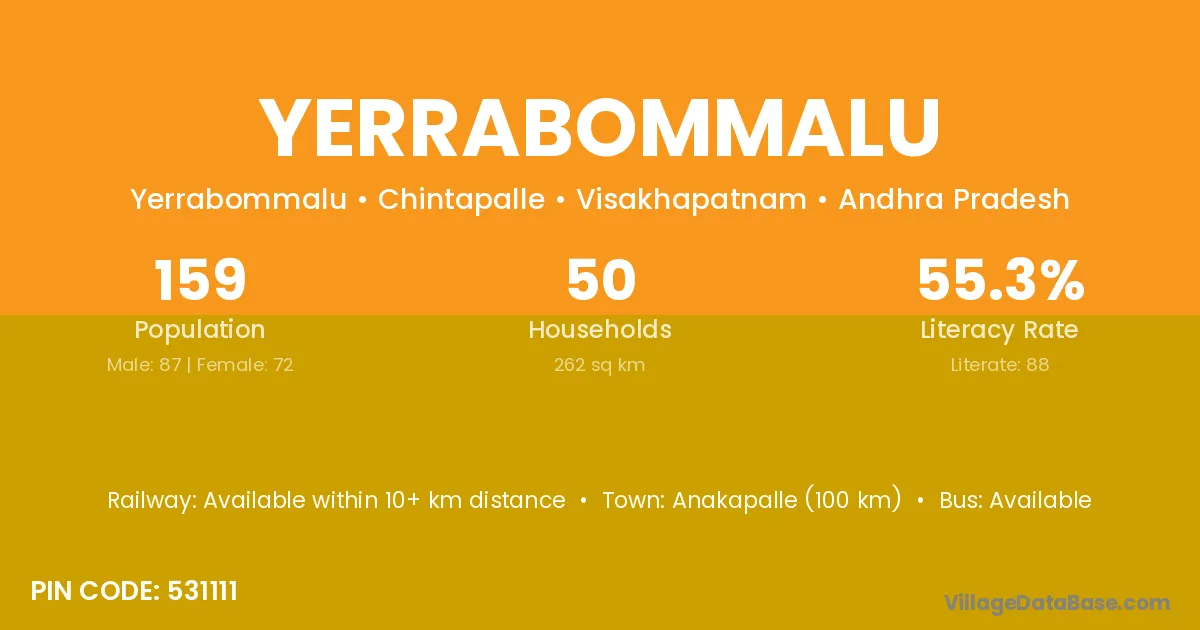 Yerrabommalu village has a total population of 159 people, of which 87 are males and 72 are females.