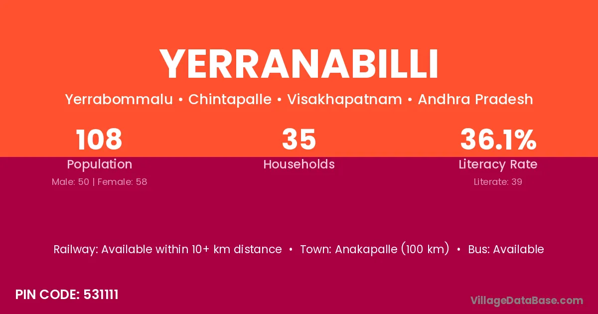 Yerranabilli village has a total population of 108 people, of which 50 are males and 58 are females.