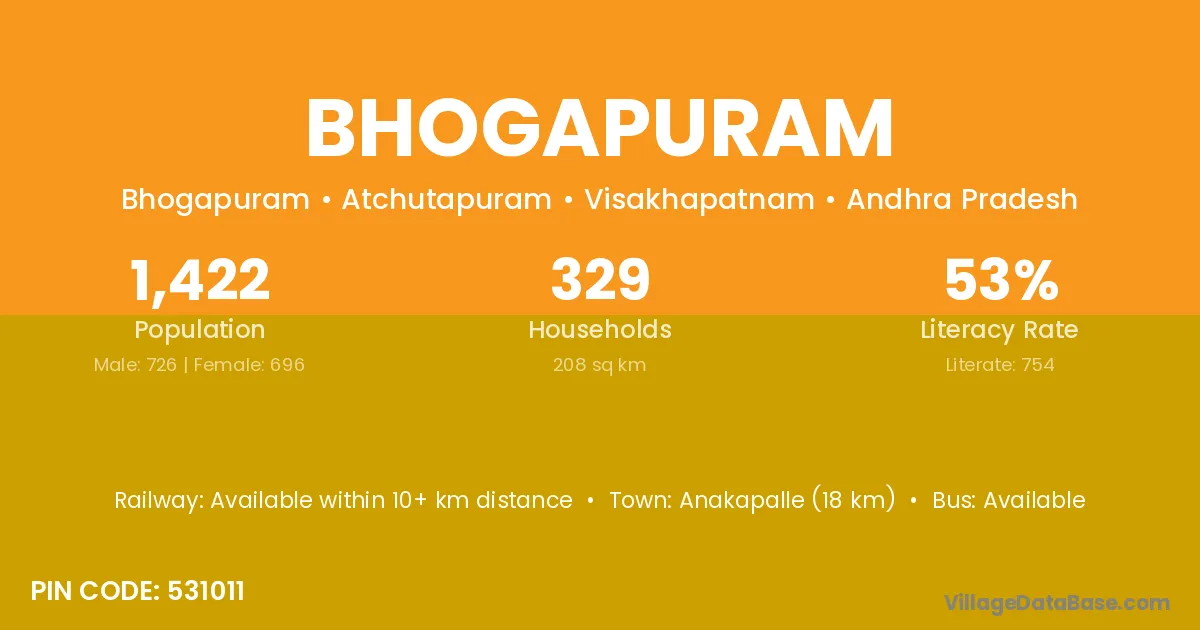 Anakapalle (20 km) is the nearest town to Bhogapuram village for major economic activities and is located approximately 20 km away.