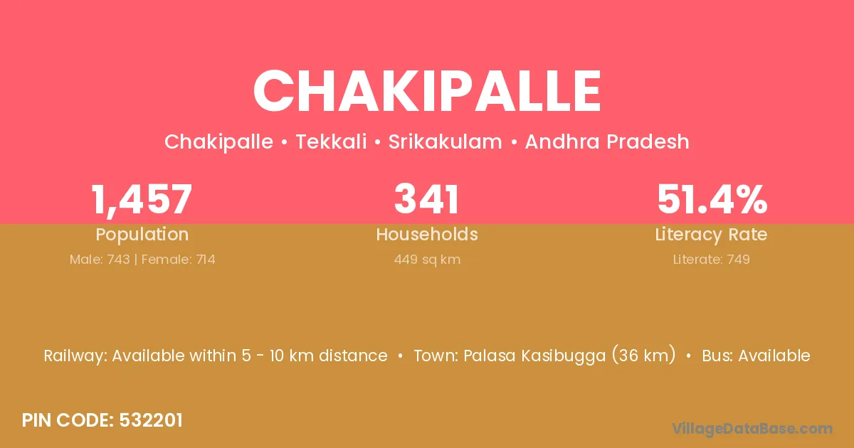 The literacy rate of Chakipalle village is 41.52%. Male literacy stands at 52.24% and female literacy at 31.11%.