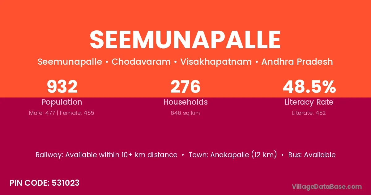 Anakapalle (12 km) is the nearest town to Seemunapalle village for major economic activities and is located approximately 12 km away.