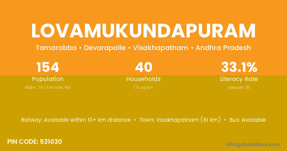 Visakhapatnam (61 km) is the nearest town to Lovamukundapuram village for major economic activities and is located approximately 61 km away.