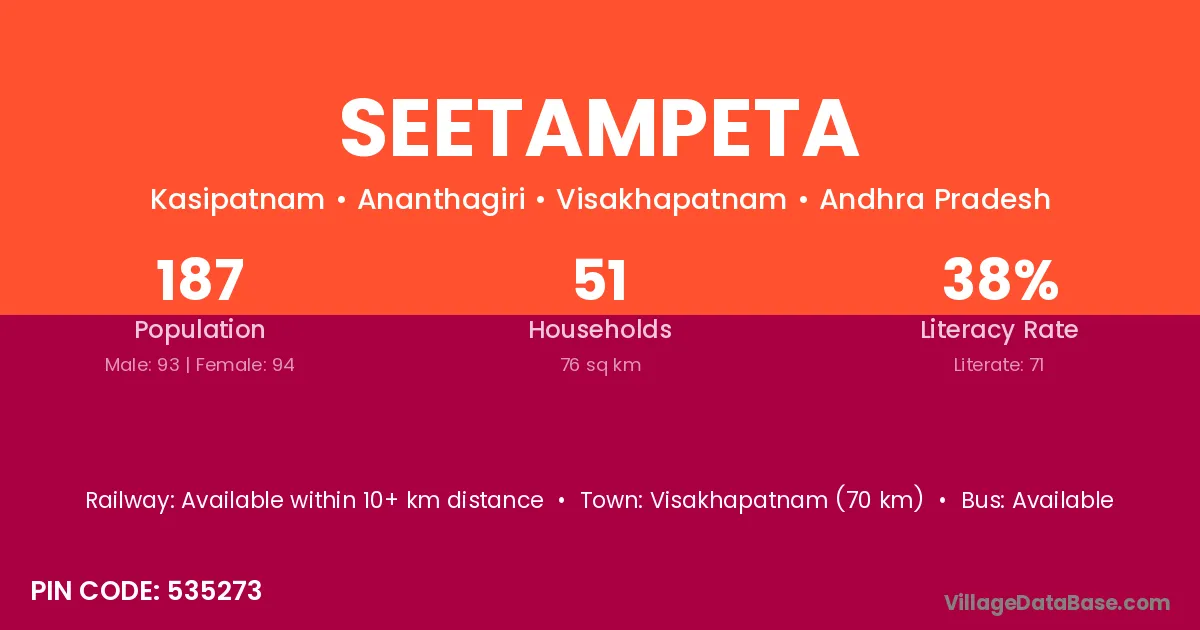 The literacy rate of Seetampeta village is 43.16%. Male literacy stands at 52.43% and female literacy at 35.13%.