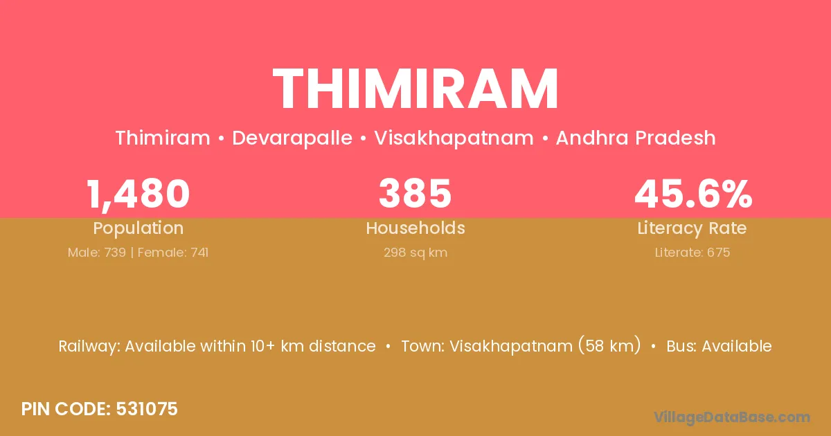 Thimiram village has a total population of 1,480 people, of which 739 are males and 741 are females.